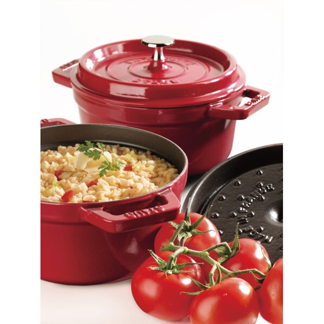 ■【ピコ・ココットの特徴】(1)真鍮のつまみ:高温でも対応可能なつまみ。オーブンでの調理などにも安心です。(2)黒マットエマイユ加工:ココットの内部はすべてストウブ独自のざらざら加工。細かな凹凸によって表面積が増えるため油なじみがよく、食材との接点が少なくなり焦げ付きにくくなります。(3)熱伝導・保温性の高さ:テーブルにそのまま出しても温かいまま料理を楽しめます。必要最低限の熱で調理が可能です